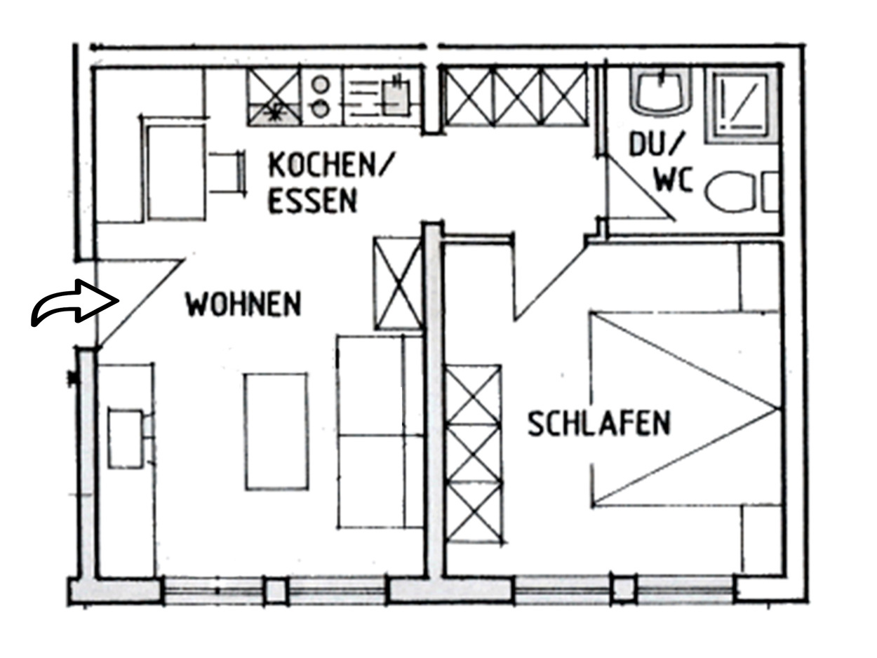 Die Ferienwohnungen bestehen aus Schlafzimmer, Wohn/-Schlafraum mit Küchenzeile und Dusche / WC. Die Schlafzimmer sind für zwei Personen ausgestattet.