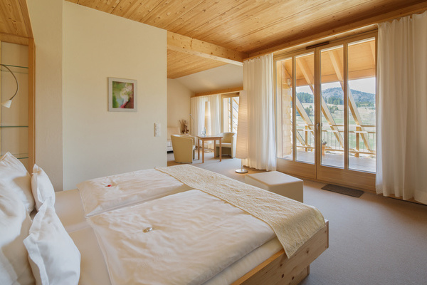 Idyllische Ruhe & endloser Blick über das Hochtal, direkt von einer der Saunen des Hochtal-Spa aus. Mit Mittagsjause, regionalem Gourmetmenü & tollem Service.zum Wellnesshotel