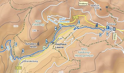 bis Brandenberg gut gekennzeichnet mit der gelben und blauen Raute sowie dem Symbol für den Wasserfallsteig und dem Hebelweg. Dann bis zum Todtnauer Wasserfall ohne Markierung. Das Stück bis Todtnau ist markiert durch die blaue Raute.