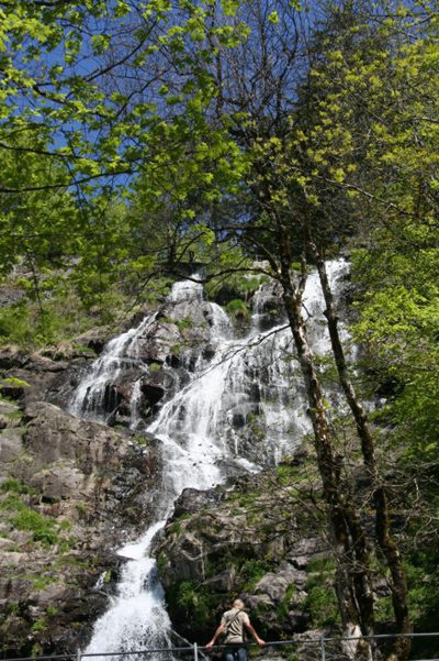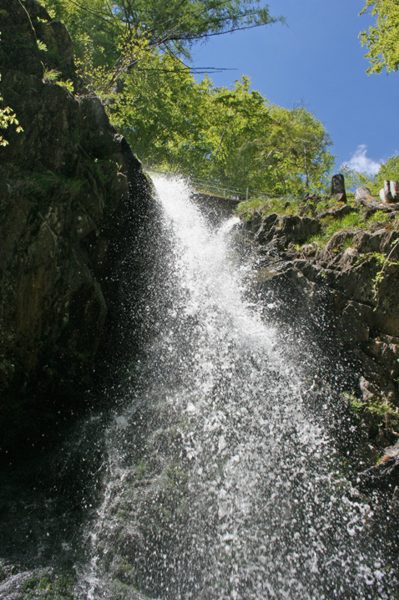 Leider endet dieses Wandervergnügen nach rund 0:30 Std. an der B 317 (3) auf Höhe einer Kaserne. Wir überqueren die Straße (Vorsicht!) und wandern oberhalb der Kasernengebäude auf einem Trampelpfad durch blumenübersäte Viehweiden unserem ersten Ziel entgegen, dem Fahler Wasserfall (4), den wir nach rund 0:50 Std. Gehzeit bestaunen. Auf rund 50 m stürzt der Rotenbach in mehreren Stufen schäumend in die Tiefe und formt dabei kleine Becken, die zu Wasserspielen und zur Abkühlung einladen – ein schöner Platz gerade für Kinder. Wer möchte, kann einen kurzen und lohnenswerten Abstecher nach rechts einlegen rund um den Wasserfall.
