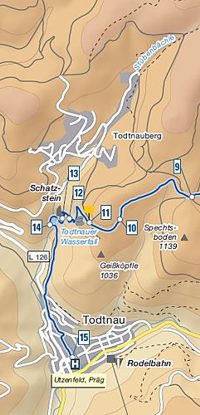 Todtnauer Wasserfall Vom Schatzstein ist es nur noch ein Katzensprung zum Highlight unserer Tour durchs Wiesental. Ganz kurz wird der Weg sehr steil und geröllig, bisweilen ist Trittsicherheit nötig. Wir wenden uns nach rechts, treten aus dem Wald heraus und hören erstmals in aller Eindrücklichkeit das Tosen des Todtnauer Wasserfalls. Schon sind wir, nach etwa 3:20 Std. Gehzeit, am „Oberen Wasserfall“ eingetroffen. Gesichert durch eine Brüstung, geht es am Felsen vorbei und auf Brücken über den Fall. Es ist gigantisch, die Wassermassen zu beobachten, wie sie senkrecht mit Tosen und Dröhnen über die Granitfelsen zu Tale stürzen. Ein romantischer Weg mit zahlreichen Brücken und Stiegen begleitet die Kaskaden in ihrer vollen Höhe und Schönheit. Hier könnte man endlos lange verweilen, sich von der Gischt kühlen lassen und Foto um Foto knipsen. Am Fuße (14) des Todtnauer Wasserfalls heißt es Abschied nehmen. Die blaue Raute zeigt uns den Weg Richtung „Todtnau“. Auf einer abschüssigen Forstpiste, die keine Überraschungen mehr bereit hält, schreiten wir in etwa 0:25 Std. durch den Hangwald auf den Ortsrand von Todtnau zu. Bei den ersten Häusern geht es auf der „Sonnenhalde“ immer hübsch bergab durch ein Wohngebiet. Dabei folgen wir bis zum Stadtkern der Beschilderung Richtung Busbahnhof (15), an dem wir nach knapp 4 Std. Gesamtwanderzeit ankommen.