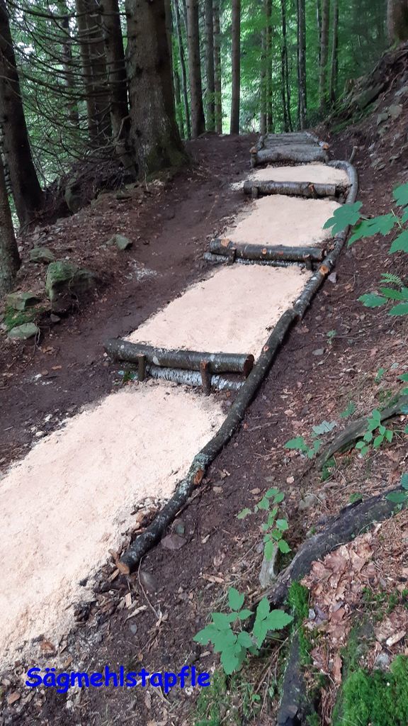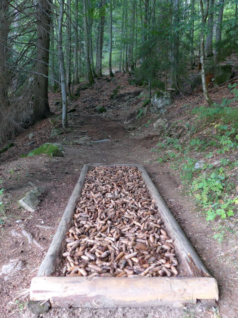 Fühlen Sie die verschiedenen Untergründe entlang des Pfades, hier gibt es Fichtenzapfen, Holz, verschiedene Sandarten, Kies, Rindenmulch und vieles mehr.