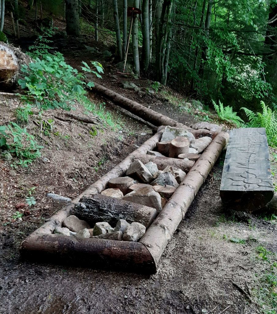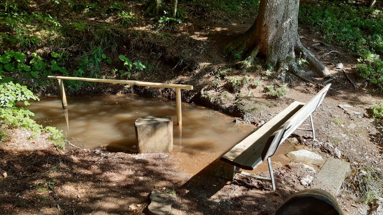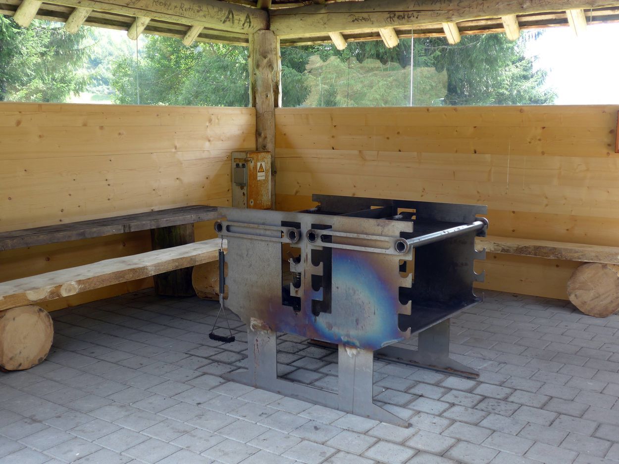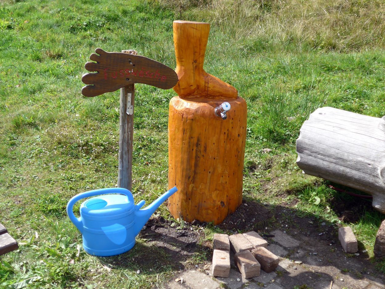 Am Eingang zum Pfad können Sie an der Grillhütte ihre Schuhe in einem Regal deponieren und nach dem Rundgang ihre Füße unter der Fußdusche oder am Brunnen mit frischem Wasser waschen.
